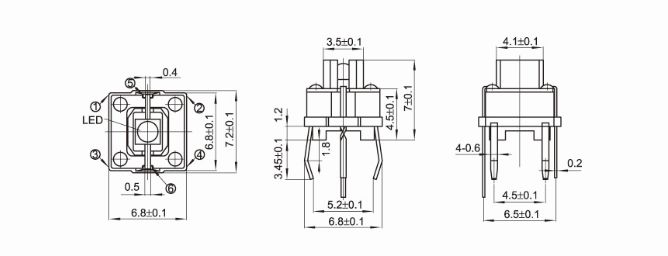 额定功率:50mA DC30V 绝缘电阻:≥100MΩ 绝缘强度:AC250V(50-60Hz) 1Minute 温度范围:-25℃ 到+85℃ 寿命:100,000 Cycles 行程:0.25±0.1mm