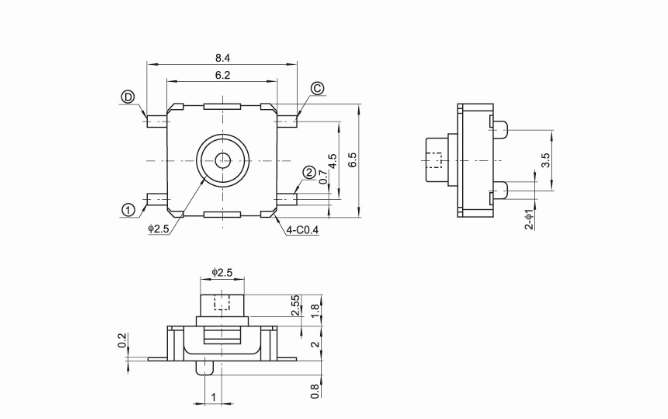双动作开关 额定功率:50mA DC12V 绝缘电阻:≥100MΩ 绝缘强度:AC250V 1Minute 温度范围:-30℃ 到+85℃ 寿命:100,000 Cycles 操作力:动作1:100±40gf 动作2:250±80gf 行程:动作1:0.3±0.1mm 动作2:0.55±0.1mm